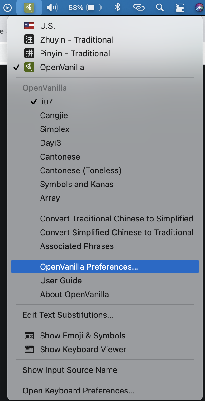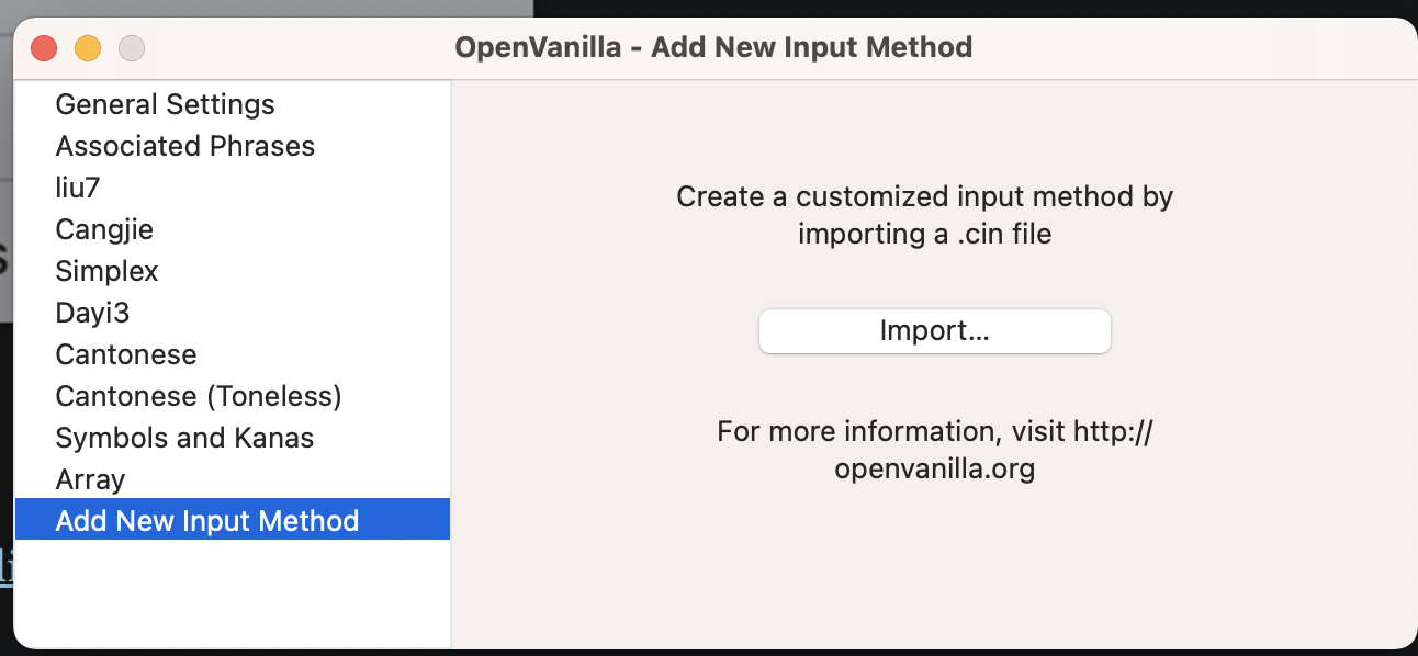 curl https://raw.githubusercontent.com/rwu823/liu/master/bundle/liu7.cin --output liu.cin3. 開啟 OpenVanilla Preferences 然後把剛剛下載的 liu.cin 文檔加到 OpenVanilla